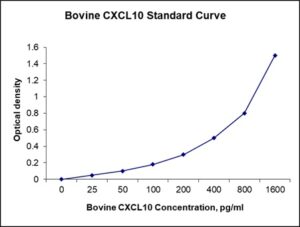 This ELISA kit is for quantification of CXCL10 in bovine. This is a quick ELISA assay that reduces time to 50% compared to the conventional method, and the entire assay only takes 3 hours. This assay employs the quantitative sandwich enzyme immunoassay technique and uses biotin-streptavidin chemistry to improve the performance of the assays. An antibody specific for CXCL10 has been pre-coated onto a microplate. Standards and samples are pipetted into the wells and any CXCL10 present is bound by the immobilized antibody. After washing away any unbound substances, a detection antibody specific for CXCL10 is added to the wells. Following wash to remove any unbound antibody reagent, a detection reagent is added. After intensive wash a substrate solution is added to the wells and color develops in proportion to the amount of CXCL10 bound in the initial step. The color development is stopped, and the intensity of the color is measured.