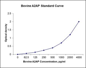 This ELISA kit is for quantification of A2AP in bovine. This is a quick ELISA assay that reduces time to 50% compared to the conventional method, and the entire assay only takes 3 hours. This assay employs the quantitative sandwich enzyme immunoassay technique and uses biotin-streptavidin chemistry to improve the performance of the assays. An antibody specific for A2AP has been pre-coated onto a microplate. Standards and samples are pipetted into the wells and any A2AP present is bound by the immobilized antibody. After washing away any unbound substances, a detection antibody specific for A2AP is added to the wells. Following wash to remove any unbound antibody reagent, a detection reagent is added. After intensive wash a substrate solution is added to the wells and color develops in proportion to the amount of A2AP bound in the initial step. The color development is stopped, and the intensity of the color is measured.