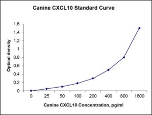 This ELISA kit is for quantification of CXCL10 in canine. This is a quick ELISA assay that reduces time to 50% compared to the conventional method, and the entire assay only takes 3 hours. This assay employs the quantitative sandwich enzyme immunoassay technique and uses biotin-streptavidin chemistry to improve the performance of the assays. An antibody specific for CXCL10 has been pre-coated onto a microplate. Standards and samples are pipetted into the wells and any CXCL10 present is bound by the immobilized antibody. After washing away any unbound substances, a detection antibody specific for CXCL10 is added to the wells. Following wash to remove any unbound antibody reagent, a detection reagent is added. After intensive wash a substrate solution is added to the wells and color develops in proportion to the amount of CXCL10 bound in the initial step. The color development is stopped, and the intensity of the color is measured.