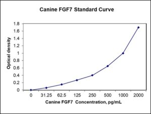 This ELISA kit is for quantification of FGF7 in canine. This is a quick ELISA assay that reduces time to 50% compared to the conventional method, and the entire assay only takes 3 hours. This assay employs the quantitative sandwich enzyme immunoassay technique and uses biotin-streptavidin chemistry to improve the performance of the assays. An antibody specific for FGF7 has been pre-coated onto a microplate. Standards and samples are pipetted into the wells and any FGF7 present is bound by the immobilized antibody. After washing away any unbound substances, a detection antibody specific for FGF7 is added to the wells. Following wash to remove any unbound antibody reagent, a detection reagent is added. After intensive wash a substrate solution is added to the wells and color develops in proportion to the amount of FGF7 bound in the initial step. The color development is stopped, and the intensity of the color is measured.