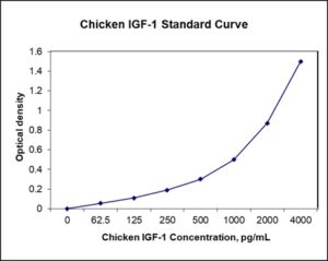 This ELISA kit is for quantification of IGF-1 in chicken. This is a quick ELISA assay that reduces time to 50% compared to the conventional method, and the entire assay only takes 3 hours. This assay employs the quantitative sandwich enzyme immunoassay technique and uses biotin-streptavidin chemistry to improve the performance of the assays. An antibody specific for IGF-1 has been pre-coated onto a microplate. Standards and samples are pipetted into the wells and any IGF-1 present is bound by the immobilized antibody. After washing away any unbound substances, a detection antibody specific for IGF-1 is added to the wells. Following wash to remove any unbound antibody reagent, a detection reagent is added. After intensive wash a substrate solution is added to the wells and color develops in proportion to the amount of IGF-1 bound in the initial step. The color development is stopped, and the intensity of the color is measured.