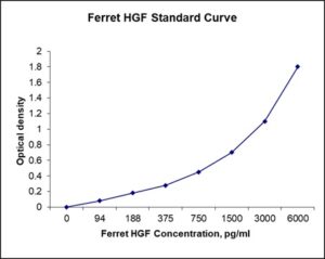 This ELISA kit is for quantification of HGF in ferret. This is a quick ELISA assay that reduces time to 50% compared to the conventional method, and the entire assay only takes 3 hours. This assay employs the quantitative sandwich enzyme immunoassay technique and uses biotin-streptavidin chemistry to improve the performance of the assays. An antibody specific for HGF has been pre-coated onto a microplate. Standards and samples are pipetted into the wells and any HGF present is bound by the immobilized antibody. After washing away any unbound substances, a detection antibody specific for HGF is added to the wells. Following wash to remove any unbound antibody reagent, a detection reagent is added. After intensive wash a substrate solution is added to the wells and color develops in proportion to the amount of HGF bound in the initial step. The color development is stopped, and the intensity of the color is measured.