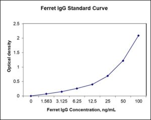 This ELISA kit is for quantification of IgG in ferret. This is a quick ELISA assay that reduces time to 50% compared to the conventional method, and the entire assay only takes 3 hours. This assay employs the quantitative sandwich enzyme immunoassay technique and uses biotin-streptavidin chemistry to improve the performance of the assays. An antibody specific for IgG has been pre-coated onto a microplate. Standards and samples are pipetted into the wells and any IgG present is bound by the immobilized antibody. After washing away any unbound substances, a detection antibody specific for IgG is added to the wells. Following wash to remove any unbound antibody reagent, a detection reagent is added. After intensive wash a substrate solution is added to the wells and color develops in proportion to the amount of IgG bound in the initial step. The color development is stopped, and the intensity of the color is measured.