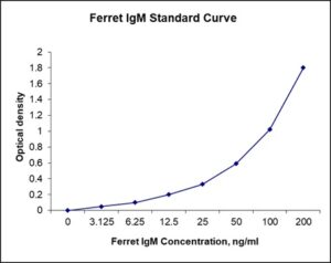 This ELISA kit is for quantification of IgM in ferret. This is a quick ELISA assay that reduces time to 50% compared to the conventional method, and the entire assay only takes 3 hours. This assay employs the quantitative sandwich enzyme immunoassay technique and uses biotin-streptavidin chemistry to improve the performance of the assays. An antibody specific for IgM has been pre-coated onto a microplate. Standards and samples are pipetted into the wells and any IgM present is bound by the immobilized antibody. After washing away any unbound substances, a detection antibody specific for IgM is added to the wells. Following wash to remove any unbound antibody reagent, a detection reagent is added. After intensive wash a substrate solution is added to the wells and color develops in proportion to the amount of IgM bound in the initial step. The color development is stopped, and the intensity of the color is measured.