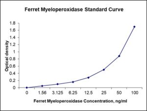 This ELISA kit is for quantification of MPO in ferret. This is a quick ELISA assay that reduces time to 50% compared to the conventional method, and the entire assay only takes 3 hours. This assay employs the quantitative sandwich enzyme immunoassay technique and uses biotin-streptavidin chemistry to improve the performance of the assays. An antibody specific for MPO has been pre-coated onto a microplate. Standards and samples are pipetted into the wells and any MPO present is bound by the immobilized antibody. After washing away any unbound substances, a detection antibody specific for MPO is added to the wells. Following wash to remove any unbound antibody reagent, a detection reagent is added. After intensive wash a substrate solution is added to the wells and color develops in proportion to the amount of MPO bound in the initial step. The color development is stopped, and the intensity of the color is measured.