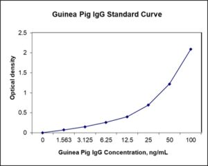 This ELISA kit is for quantification of IgG in guinea pig. This is a quick ELISA assay that reduces time to 50% compared to the conventional method, and the entire assay only takes 3 hours. This assay employs the quantitative sandwich enzyme immunoassay technique and uses biotin-streptavidin chemistry to improve the performance of the assays. An antibody specific for IgG has been pre-coated onto a microplate. Standards and samples are pipetted into the wells and any IgG present is bound by the immobilized antibody. After washing away any unbound substances, a detection antibody specific for IgG is added to the wells. Following wash to remove any unbound antibody reagent, a detection reagent is added. After intensive wash a substrate solution is added to the wells and color develops in proportion to the amount of IgG bound in the initial step. The color development is stopped, and the intensity of the color is measured.