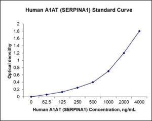 This ELISA kit is for quantification of A1AT (SERPINA1) in human. This is a quick ELISA assay that reduces time to 50% compared to the conventional method, and the entire assay only takes 3 hours. This assay employs the quantitative sandwich enzyme immunoassay technique and uses biotin-streptavidin chemistry to improve the performance of the assays. An antibody specific for A1AT (SERPINA1) has been pre-coated onto a microplate. Standards and samples are pipetted into the wells and any A1AT (SERPINA1) present is bound by the immobilized antibody. After washing away any unbound substances, a detection antibody specific for A1AT (SERPINA1) is added to the wells. Following wash to remove any unbound antibody reagent, a detection reagent is added. After intensive wash a substrate solution is added to the wells and color develops in proportion to the amount of A1AT (SERPINA1) bound in the initial step. The color development is stopped, and the intensity of the color is measured.