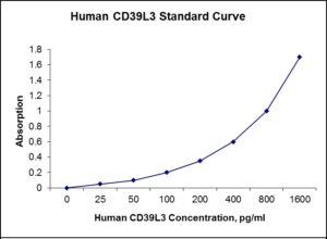 This ELISA kit is for quantification of CD39L3 in human. This is a quick ELISA assay that reduces time to 50% compared to the conventional method, and the entire assay only takes 3 hours. This assay employs the quantitative sandwich enzyme immunoassay technique and uses biotin-streptavidin chemistry to improve the performance of the assays. An antibody specific for CD39L3 has been pre-coated onto a microplate. Standards and samples are pipetted into the wells and any CD39L3 present is bound by the immobilized antibody. After washing away any unbound substances, a detection antibody specific for CD39L3 is added to the wells. Following wash to remove any unbound antibody reagent, a detection reagent is added. After intensive wash a substrate solution is added to the wells and color develops in proportion to the amount of CD39L3 bound in the initial step. The color development is stopped, and the intensity of the color is measured.