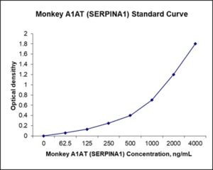 This ELISA kit is for quantification of A1AT (SERPINA1) in monkey. This is a quick ELISA assay that reduces time to 50% compared to the conventional method, and the entire assay only takes 3 hours. This assay employs the quantitative sandwich enzyme immunoassay technique and uses biotin-streptavidin chemistry to improve the performance of the assays. An antibody specific for A1AT (SERPINA1) has been pre-coated onto a microplate. Standards and samples are pipetted into the wells and any A1AT (SERPINA1) present is bound by the immobilized antibody. After washing away any unbound substances, a detection antibody specific for A1AT (SERPINA1) is added to the wells. Following wash to remove any unbound antibody reagent, a detection reagent is added. After intensive wash a substrate solution is added to the wells and color develops in proportion to the amount of A1AT (SERPINA1) bound in the initial step. The color development is stopped, and the intensity of the color is measured.