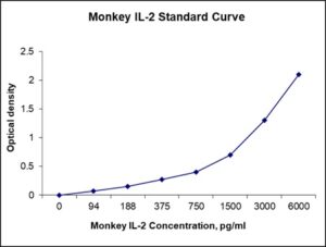 This ELISA kit is for quantification of IL-2 in monkey. This is a quick ELISA assay that reduces time to 50% compared to the conventional method, and the entire assay only takes 3 hours. This assay employs the quantitative sandwich enzyme immunoassay technique and uses biotin-streptavidin chemistry to improve the performance of the assays. An antibody specific for IL-2 has been pre-coated onto a microplate. Standards and samples are pipetted into the wells and any IL-2 present is bound by the immobilized antibody. After washing away any unbound substances, a detection antibody specific for IL-2 is added to the wells. Following wash to remove any unbound antibody reagent, a detection reagent is added. After intensive wash a substrate solution is added to the wells and color develops in proportion to the amount of IL-2 bound in the initial step. The color development is stopped, and the intensity of the color is measured.