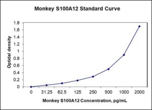 This ELISA kit is for quantification of S100A12 in monkey. This is a quick ELISA assay that reduces time to 50% compared to the conventional method, and the entire assay only takes 3 hours. This assay employs the quantitative sandwich enzyme immunoassay technique and uses biotin-streptavidin chemistry to improve the performance of the assays. An antibody specific for S100A12 has been pre-coated onto a microplate. Standards and samples are pipetted into the wells and any S100A12 present is bound by the immobilized antibody. After washing away any unbound substances, a detection antibody specific for S100A12 is added to the wells. Following wash to remove any unbound antibody reagent, a detection reagent is added. After intensive wash a substrate solution is added to the wells and color develops in proportion to the amount of S100A12 bound in the initial step. The color development is stopped, and the intensity of the color is measured.