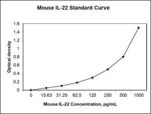 This ELISA kit is for quantification of IL-22 in mouse. This is a quick ELISA assay that reduces time to 50% compared to the conventional method, and the entire assay only takes 3 hours. This assay employs the quantitative sandwich enzyme immunoassay technique and uses biotin-streptavidin chemistry to improve the performance of the assays. An antibody specific for IL-22 has been pre-coated onto a microplate. Standards and samples are pipetted into the wells and any IL-22 present is bound by the immobilized antibody. After washing away any unbound substances, a detection antibody specific for IL-22 is added to the wells. Following wash to remove any unbound antibody reagent, a detection reagent is added. After intensive wash a substrate solution is added to the wells and color develops in proportion to the amount of IL-22 bound in the initial step. The color development is stopped, and the intensity of the color is measured.