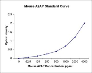 This ELISA kit is for quantification of A2AP in mouse. This is a quick ELISA assay that reduces time to 50% compared to the conventional method, and the entire assay only takes 3 hours. This assay employs the quantitative sandwich enzyme immunoassay technique and uses biotin-streptavidin chemistry to improve the performance of the assays. An antibody specific for A2AP has been pre-coated onto a microplate. Standards and samples are pipetted into the wells and any A2AP present is bound by the immobilized antibody. After washing away any unbound substances, a detection antibody specific for A2AP is added to the wells. Following wash to remove any unbound antibody reagent, a detection reagent is added. After intensive wash a substrate solution is added to the wells and color develops in proportion to the amount of A2AP bound in the initial step. The color development is stopped, and the intensity of the color is measured.