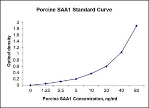 This ELISA kit is for quantification of SAA1 in porcine. This is a quick ELISA assay that reduces time to 50% compared to the conventional method, and the entire assay only takes 3 hours. This assay employs the quantitative sandwich enzyme immunoassay technique and uses biotin-streptavidin chemistry to improve the performance of the assays. An antibody specific for SAA1 has been pre-coated onto a microplate. Standards and samples are pipetted into the wells and any SAA1 present is bound by the immobilized antibody. After washing away any unbound substances, a detection antibody specific for SAA1 is added to the wells. Following wash to remove any unbound antibody reagent, a detection reagent is added. After intensive wash a substrate solution is added to the wells and color develops in proportion to the amount of SAA1 bound in the initial step. The color development is stopped, and the intensity of the color is measured.